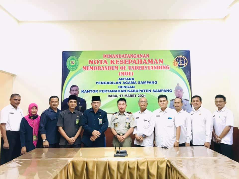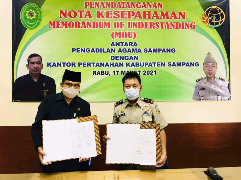 Pada hari rabu tanggal 17 Maret 2021, telah dilaksanakan Penandatanganan Memorandum Of Understanding (MOU) Layanan Sidang Terpadu antara Pengadilan Agama Sampang dengan Kantor Wilayah Pertanahan Kabupaten Sampang mengenai percepatan pengurusan penetapan ahli waris sebagai kelengkapan permohonan sertifikat melalui pendaftaran tanah sistematis lengkap (PTSL) dan sertifikat massal lainnya serta sita dan eksekusi.