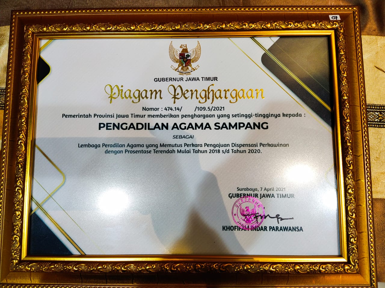 ALHAMDULILLAH PENGADILAN AGAMA SAMPANG MENDAPATKAN PIAGAM PENGHARGAAN DARI PEMERINTAH PROVINSI JAWA TIMUR SEBAGAI LEMBAGA PERADILAN AGAMA YANG MEMUTUSKAN PERKARA PENGAJUAN DISPENSASI PERKAWINAN DENGAN PRESENTASE TERENDAH MULAI TAHUN 2018 S/D TAHUN 2020.